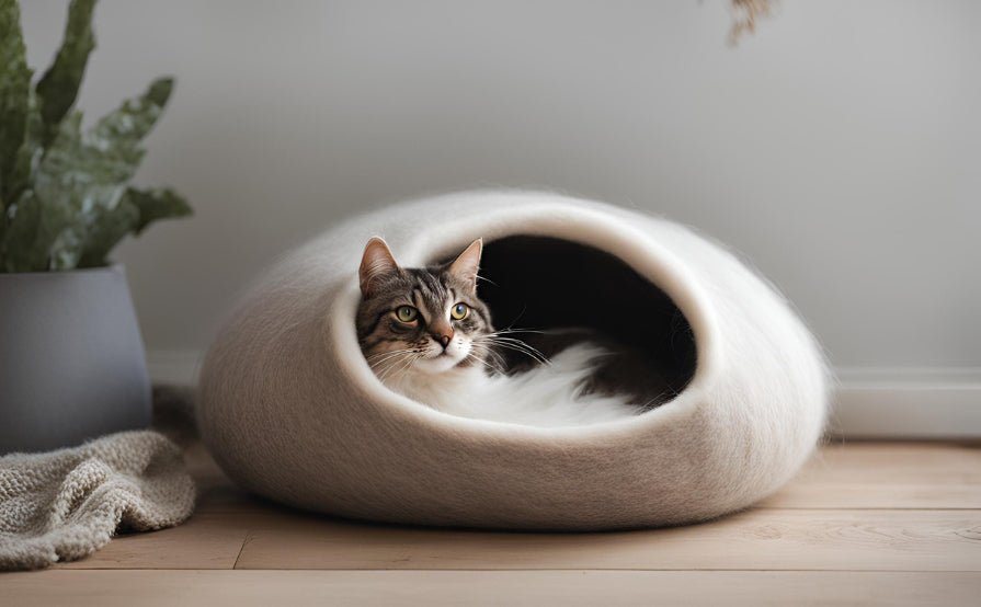 Each Cat Cave is hand-felted with love from the highest quality, soft merino wool to ensure that your pet is happy and healthy. They are handmade with 100% organic materials - no chemicals, no emissions, no factories… just love.
